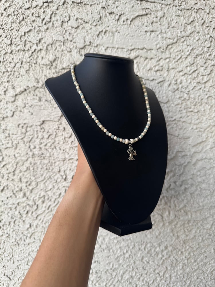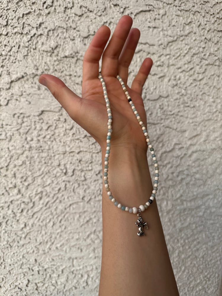 16ā silver wiring with amazonite beads in soft beige hues, finished with a silver angel charm ā a reminder to stay centered and in tune with your path.