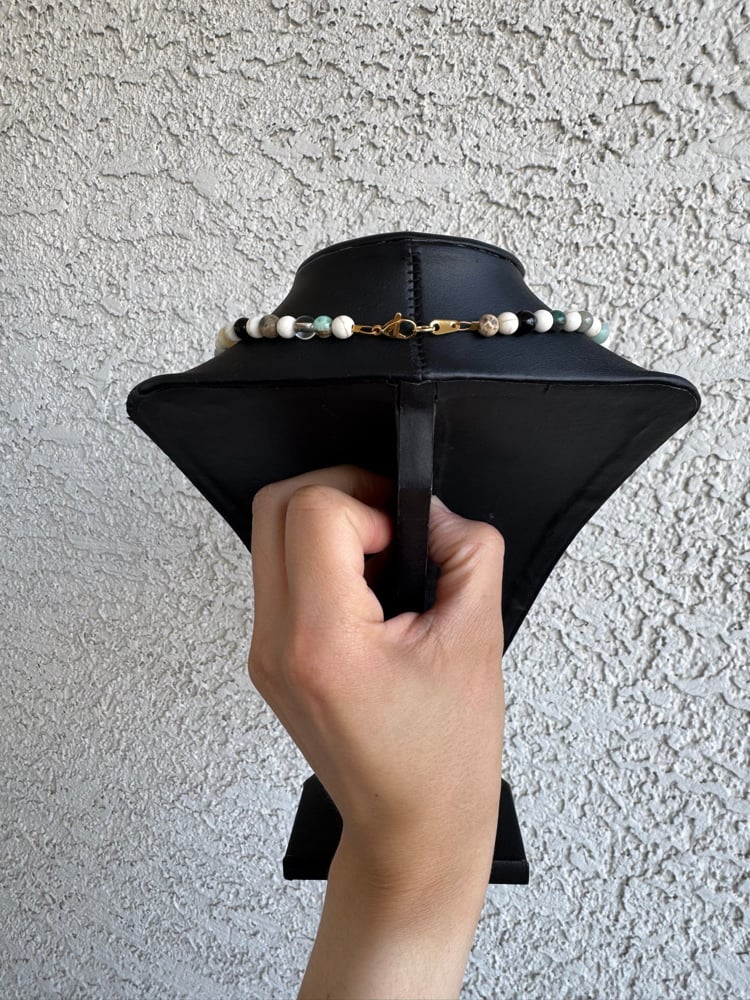 An 18-inch gold-wired necklace strung with a harmonious blend of mixed stones in calming beige tones, designed to bring you closer to nature while adding a subtle elegance to your everyday look.