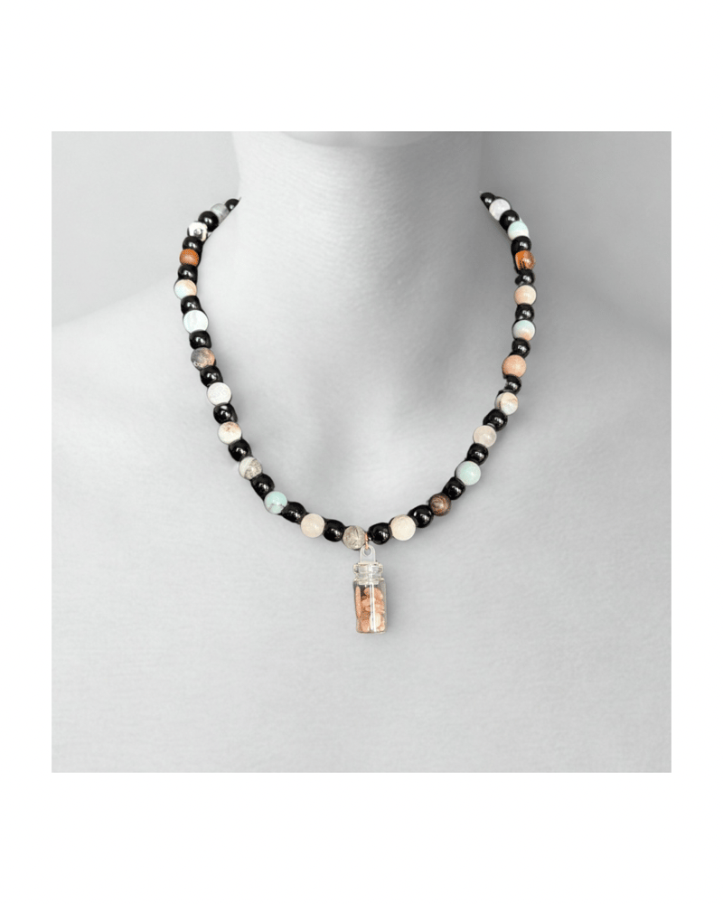 An 18-inch gold wire necklace handcrafted with a calming mix of amazonite and grounding obsidian stones. Finished with a tiny glass jar filled with stones, this piece symbolizes balance—peaceful energy held steady by strength and protection. Designed to be worn daily as a reminder to stay centered, intentional, and true to yourself.Price: $27