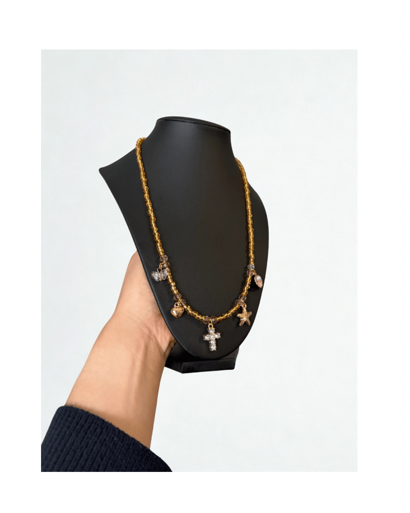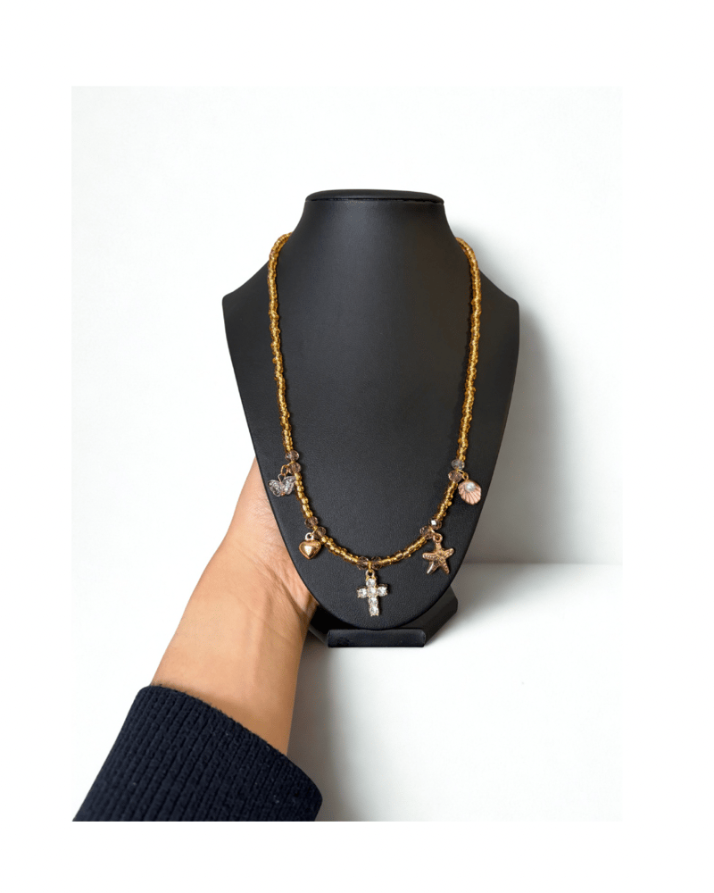 Heavenly Orbit is a 22in handcrafted gold wire necklace designed with warm golden beads and a curated mix of meaningful charms. Featuring a crystal cross at the center, paired with celestial and heart details throughout, this piece symbolizes faith, love, protection, and guidance. Its longer length makes it perfect for layering or wearing as a standalone statement. Each necklace is thoughtfully handmade by Studio7evin, making every piece truly one of a kind.
