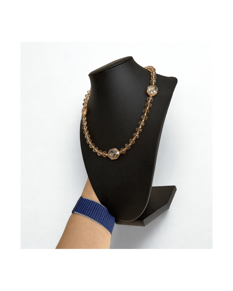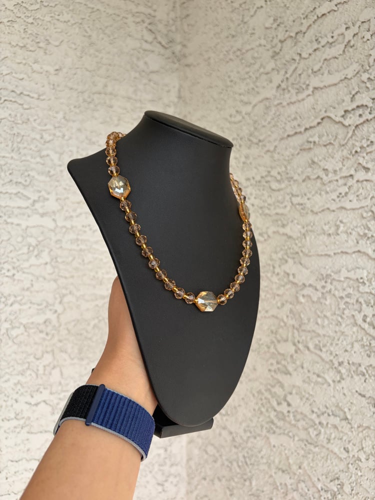 The Honey Halo is an 18-inch handcrafted necklace wired in warm gold and designed to radiate soft, golden energy. Featuring faceted champagne-toned beads and bold statement-cut center stones, this piece catches the light beautifully from every angle.