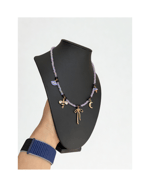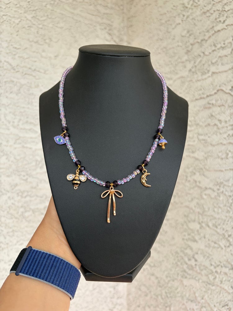 The Mystic Thread is an 18-inch handcrafted necklace wired in warm gold and layered with soft lavender beads and deep crystal accents. Finished with symbolic charms — including a bow, crescent moon, bee, and protective eye — this piece tells a story of intuition, growth, protection, and gentle strength.