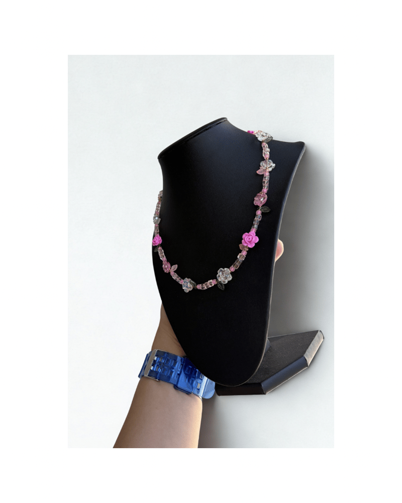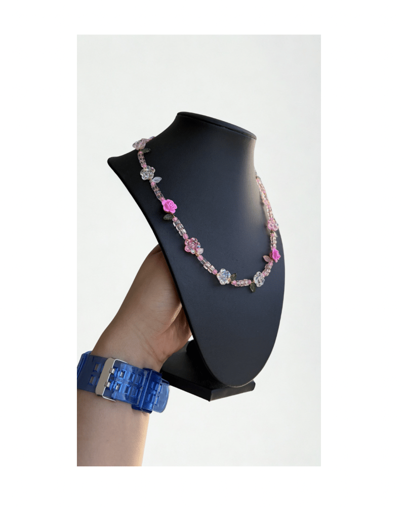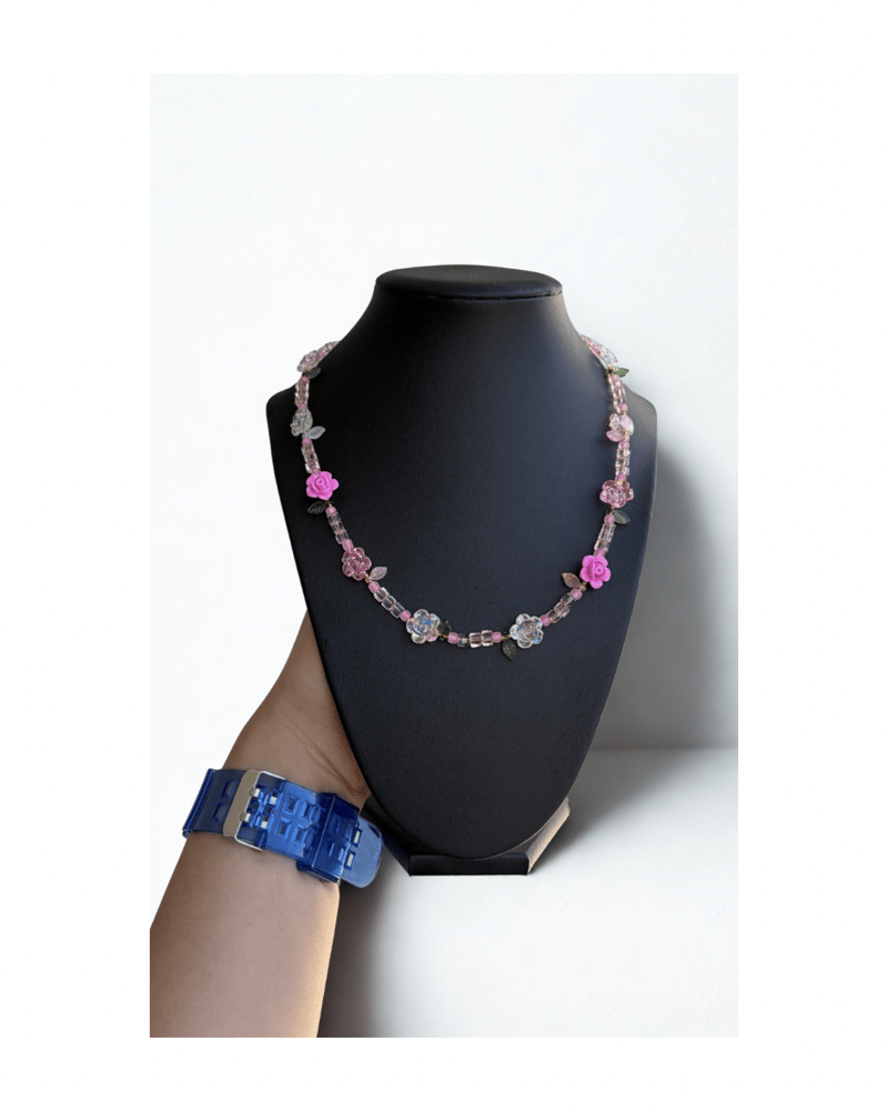 Handcrafted 18in gold wiring necklace featuring delicate rose bud beads, soft pink tones, and iridescent floral accents. This piece captures a dreamy garden feel with a subtle sparkle, making it perfect for layering or wearing as a statement on its own.